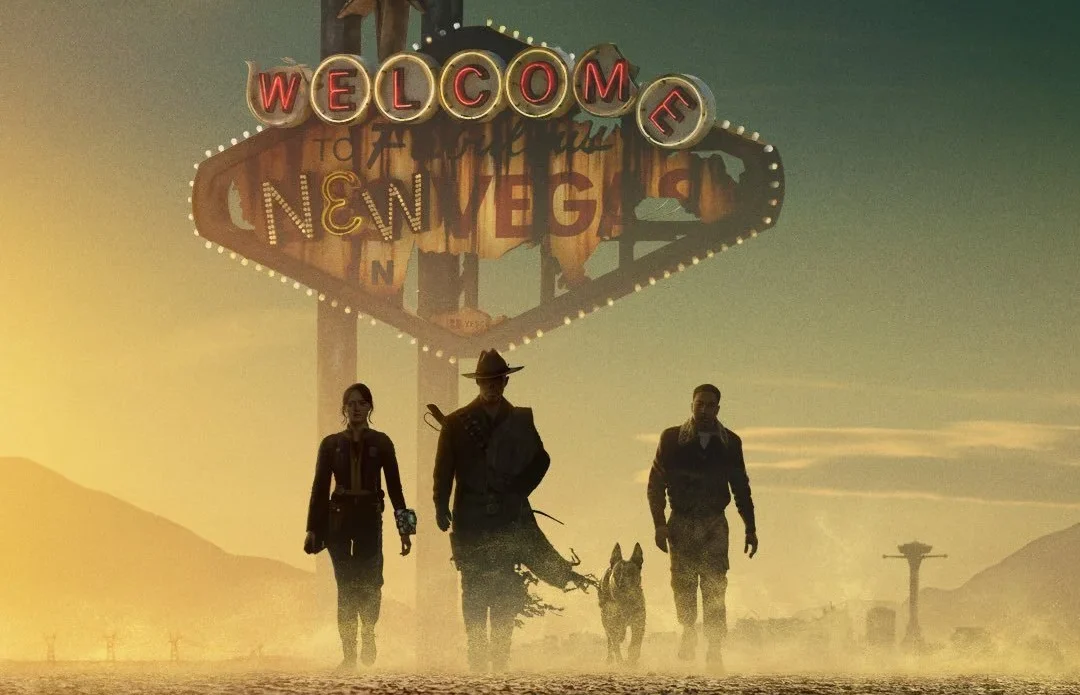 La imagen muestra al grupo avanzando por un desierto abrasador hacia el icónico letrero de “Welcome to New Vegas”, con el resplandor de la ciudad en el horizonte. Esta ubicación, célebre en el videojuego Fallout: New Vegas de Obsidian Entertainment, promete una trama cargada de intrigas políticas, facciones enfrentadas y misterios radioactivos.