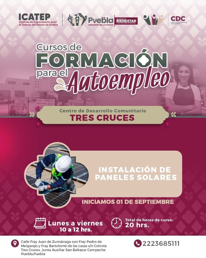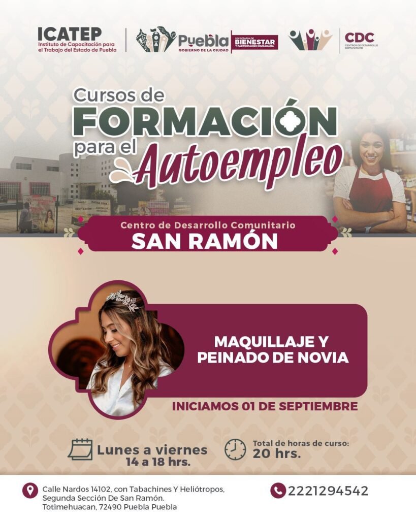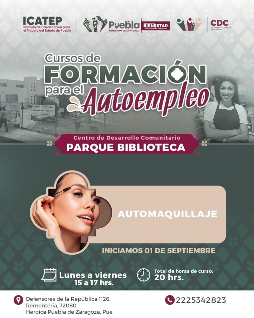 Puebla, Pue., 26 de agosto de 2025.- El Gobierno de la Ciudad, en coordinación con el Instituto de Capacitación para el Trabajo del Estado de Puebla (ICATEP), invita a la ciudadanía a inscribirse en los cursos gratuitos de capacitación para el autoempleo que se realizarán a partir del mes de septiembre en distintos Centros de Desarrollo Comunitario (CDC) y en el Parque Biblioteca. Esta iniciativa responde al compromiso del presidente municipal, Pepe Chedraui Budib, de fomentar el desarrollo económico y poner orden en la capital.
