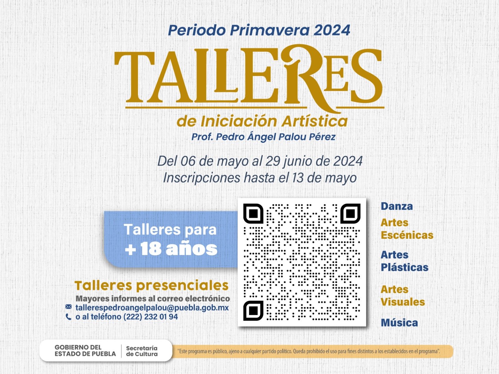 El plazo para inscribirse permanecerá abierto hasta el lunes 13 de mayo. Aquellos interesados en participar o que requieran más información sobre los requisitos pueden comunicarse al correo tallerespedroangelpalou@puebla.gob.mx o llamar al teléfono (222) 232 01 94. También pueden visitar las oficinas de los talleres, que se encuentran en la Avenida 7 Oriente número 2, en el Centro Histórico.