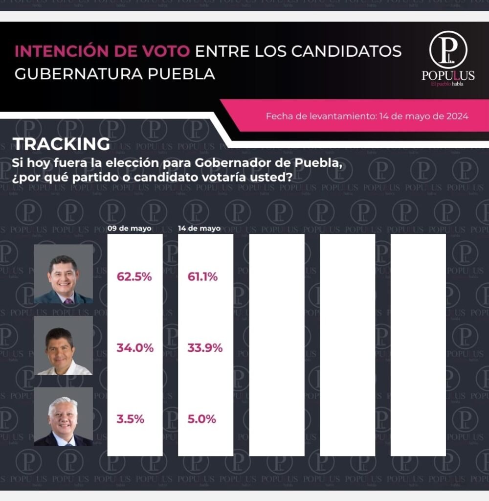 Es importante destacar que el muestreo realizado por Populus Mx cuenta con un nivel de confianza del 95%, con un margen de error del 4%. Este estudio se llevó a cabo entre ciudadanas y ciudadanos de Puebla mayores de 18 años el martes 14 de mayo.
