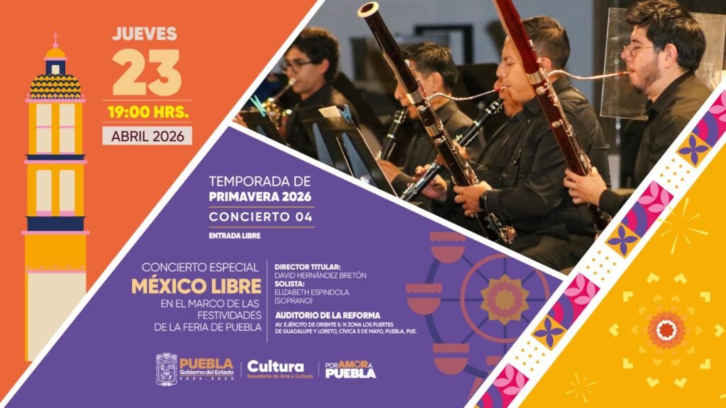 CIUDAD DE PUEBLA, Pue. – Como parte de las actividades de apertura de la Feria de Puebla 2026, este jueves 23 de abril a las 19:00 horas, la Orquesta Sinfónica del Estado de Puebla (OSEP) ofrecerá el concierto especial “México Libre” en el Auditorio de la Reforma, bajo la dirección de David Hernández Bretón.