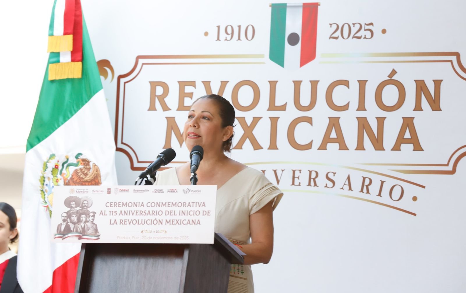 Como oradora oficial de la Ceremonia Conmemorativa al 115 Aniversario del Inicio de la Revolución Mexicana, la secretaria de Bienestar Laura Artemisa García Chávez recordó que a más de un siglo de distancia, tal y como lo soñaron las y los revolucionarios, hoy México es un país de libertades, donde los derechos de todas y todos no dependen del poder ni del dinero, sino de la calidad humana. Por ello, invitó a las y los poblanos a sumarse a la visión humanista del Gobierno del Estado de Puebla que encabeza el mandatario Alejandro Armenta y Pensar en Grande, hacer equipo, construir con valentía y con convicción.