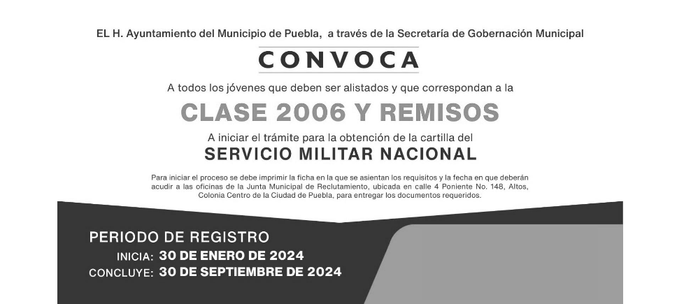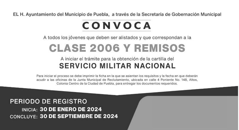 La Junta Municipal de Reclutamiento del Municipio de Puebla ha anunciado los procedimientos para que los jóvenes Clase 2006 y remisos, así como aquellos interesados en el Servicio Militar Nacional (SMN), puedan obtener su Ficha de Registro y realizar los trámites correspondientes para la obtención de la cartilla militar.