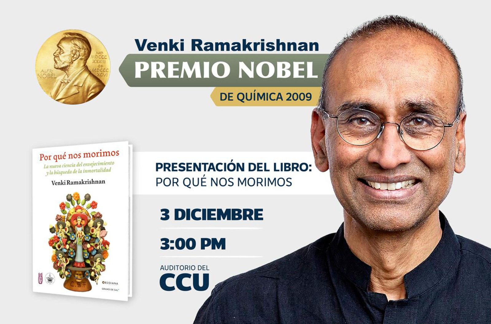 En las últimas décadas, cada vez más la ciencia se acerca al conocimiento sobre los fundamentos del envejecimiento. Para compartir con los universitarios estas reflexiones, Venki Ramakrishnan, Premio Nobel de Química 2009, estará en la BUAP este 3 de diciembre para presentar su libro ¿Por qué morimos? La cita es a las 15:00 horas, en el auditorio del Complejo Cultural Universitario.